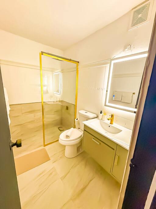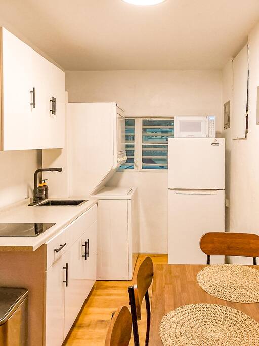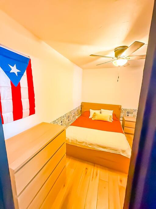 This fully renovated 2-bedroom, 2-bathroom apartment offers a vibrant and comfortable stay. As you enter, you’ll be welcomed by a DtMF-themed dominoes area to your left—perfect for enjoying a true local pastime. The open-concept layout flows into a spacious living room featuring a cozy L-shaped sofa-bed and a 65" smart TV, and WiFi, ideal for relaxing after a day of exploring. To the left, you'll find a fully equipped kitchen with all the essentials for home-cooked meals, as well as a convenient laundry area with washer and dryer. The master bedroom includes a queen-size bed, nightstand, two chests, and a closet for ample storage. The second bedroom, though smaller, offers a full-size bed, nightstand, chest, and closet. Both bathrooms feature modern rainfall showers and come stocked with all the bathing essentials to make your stay as comfortable as possible.